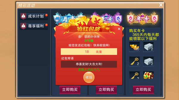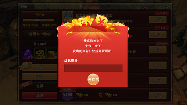 2.开红包---本国其他玩家可以通过世界聊天频道点击相应对话来抢红包,手快有手慢无,发送一次每人可以抢到至多1个红包,红包内含元宝额度随机,跟发放的元宝总值相关;