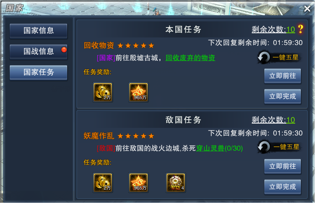 国家任务分为本国任务和敌国任务,本国任务19级开启,敌国任务21级开启。本国任务都是在自己国家做一些简单的任务,相对比较轻松,而敌国任务则要去敌国 做任务,危险系数升高,当然富贵险中求,奖励也会更加丰厚。国家任务有星级区别,星级越高,奖励越好。