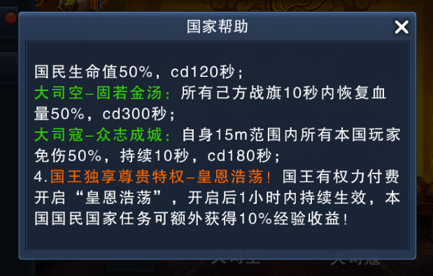 2.国王可以消耗元宝开启“皇恩浩荡”,从开启后1小时内持续生效,在该状态下该国国民做国家任务可额外获得10%经验收益;